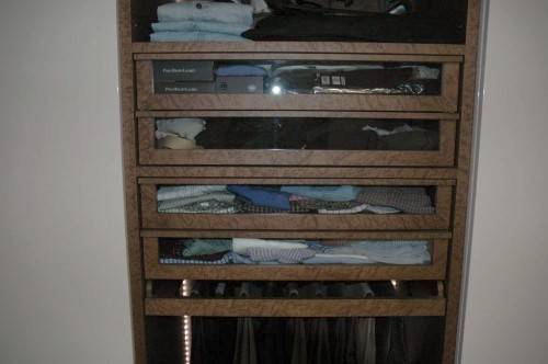 Voici un exemple partiel de dressing. Chacun peut accueillir le sien par une fabrication spécifique tenant compte des contraintes de votre espace et de vos envies.